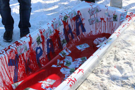 Щоб показати, за які гроші і ким фінансується це кровопролиття, активісти пофарбували імпровізовані купюри "європейської валюти" та виклали ними слово Yanukovych на асфальті перед банком.