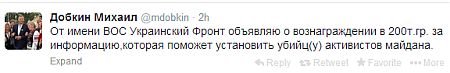 "Від імені ВГС "Український фронт" оголошую про винагороду у 200 тис. грн за інформацію, яка допоможе встановити вбивць(ю) активістів майдану", - уточнив Добкін.