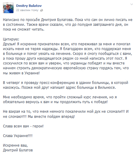 Сам Булатов писати поки не в змозі. Також лікарі сказали, що до полудня завтрашнього дня, він поки не зможе читати, наголошується в повідомленні.