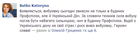 "Виявляється, вибухівку сьогодні занесли не тільки в будинок Профспілок, але й Український Дім", - написала вона.