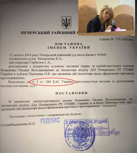 Рішення стосувалося позову Коваленко до інспектора Панченка, який в порушення законодавства склав протокол за сфальсифікованим рапортом інспектора Козака за поїздку у Межигір'я 29 грудня.