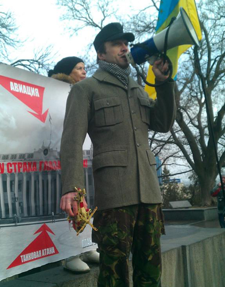 Євромайданівець у військовій формі з намальованими вусами оголосив про "захоплення адмінбудівлі бандерівцями".