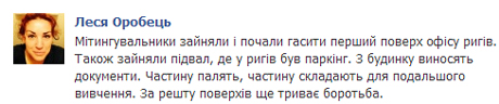 "Також зайняли підвал, де у регіонів був паркінг. З будинку виносять документи. Частину палять, частину складають для подальшого вивчення. За решту поверхів ще триває боротьба". – повідомила Оробець.