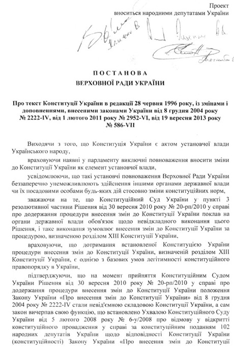 ЛІГАБізнесІнформ опублікувало документ, який нібито опозиція зареєструвала. Під текстом проекту постанови стоять підписи лідерів опозиції.