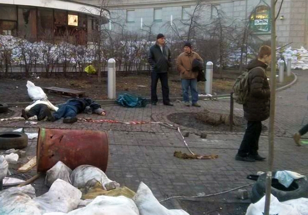На барикаді, розташованій на вулиці Інститутській, біля верхнього входу в метро "Хрещатик", лежать 2 мертві людини.