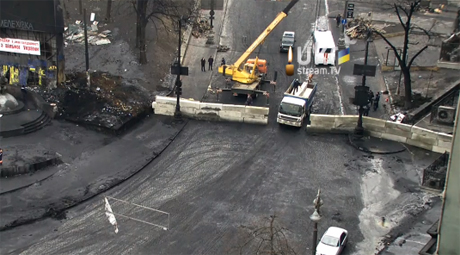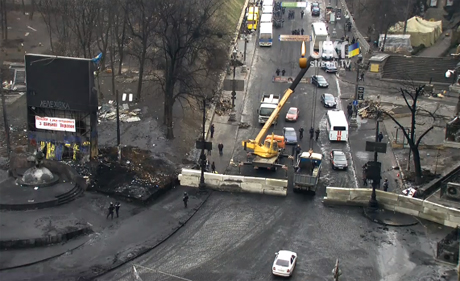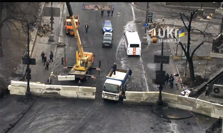 На вулиці Грушевського, де вночі прибрали залишки барикад, вдень будують стіну з залізобетонних плит.
