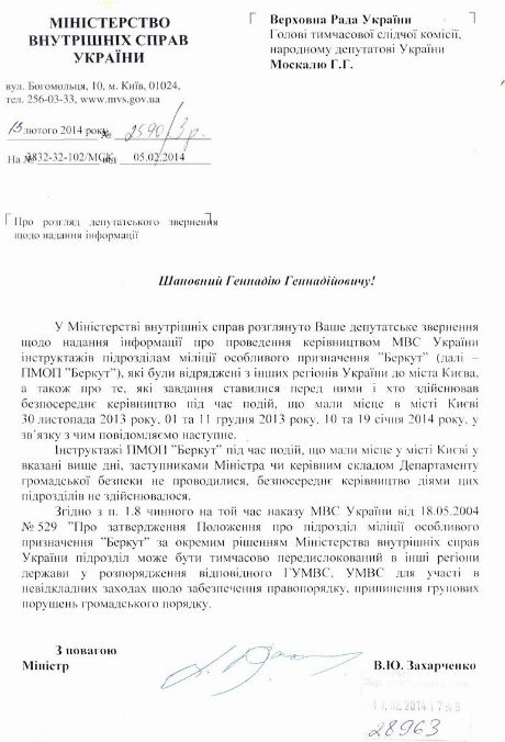 У той же час, Захарченко твердить, що ні його заступники, ні керівники департаменту громадської безпеки МВС не керували діями "Беркуту" під час кривавих подій 30 листопада, 1 та 11 грудня, 10 та 19 січня.
