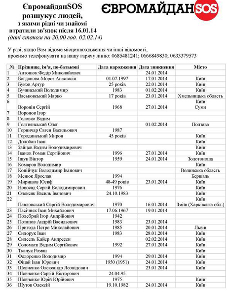 Як повідомляє спільнота активістів Євромайдан SOS, станом на 20:00 2 лютого спільнота має інформацію про пошук 36 осіб із різних міст України. Список постійно оновлюється і уточнюється.