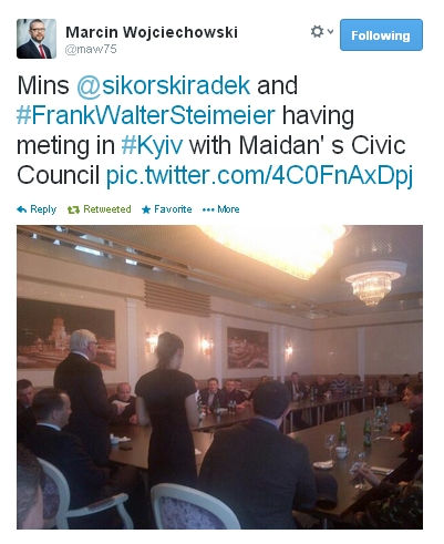 Глави МЗС Польщі Радослав Сікорські та Німеччини Франк Штейнмайєр провели зустріч з Радою Майдану і поїхали до президентської адміністрації.