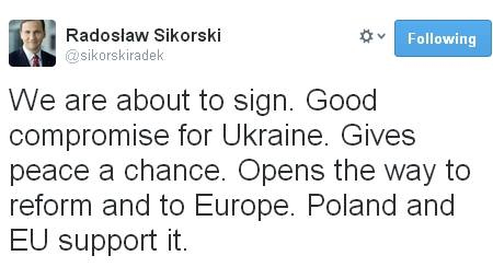 Як відомо, раніше глава МЗС Польщі Радослав Сікорські зазначив, що ЄС вважає угоду щодо виходу із кризової ситуації "хорошим компромісом" для України, який дає шанс миру і відкриває шлях до реформ і до Європи.
