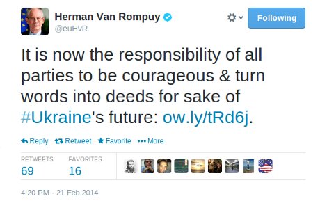 Херман Ван Ромпей, голова Ради Європи, у своєму повідомленні у Twitter підкреслив, що "підписання угоди було необхідним компромісом, запуском політичиного діалогу для демократичного, мирного врегулювання питання"