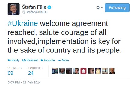 Комісар ЄС з розширення та політики добросусідства Штефан Фюле також заявив, що він вітає досягнення згоди та віддає належне хоробрості усіх, хто мав стосуно до цього.