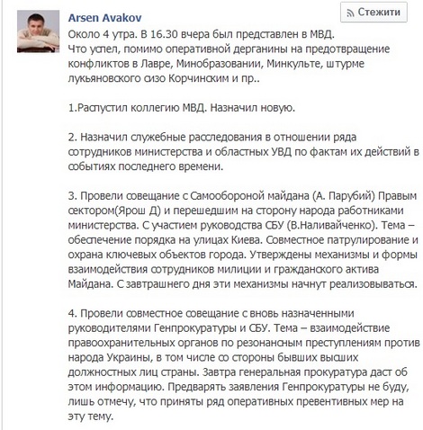 "Тема - забезпечення порядку на вулицях Києва. Спільне патрулювання та охорона ключових об'єктів міста. Затверджено механізми та форми взаємодії співробітників міліції та цивільного активу Майдану. З завтрашнього дня ці механізми почнуть реалізовуватися", - пише Аваков.