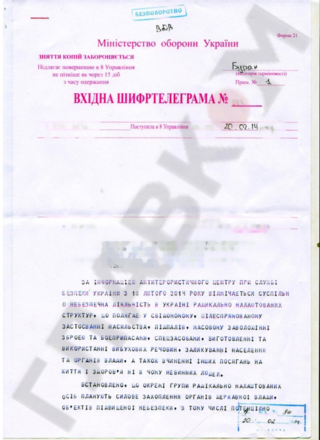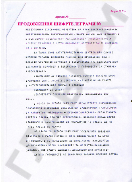 Такі шифрограми надійшли командувачам 25-ю окремою повітряно-десантною бригадою (Дніпропетровськ), 79-ю окремою аеромобільною бригадою (Миколаїв), 73-м морським центром спецпризначення (Очаків) та 1-ю окремою бригадою морської піхоти.