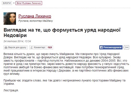 "Велика кількість думок, що зараз линуть Майданом. Ми говорили про Уряд Народної Довіри. Виглядає на те, що формується уряд народної Недовіри. Все кулуарно", - написала Руслана.