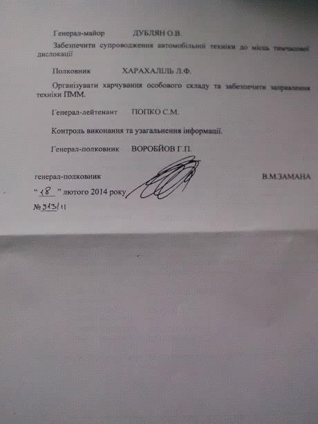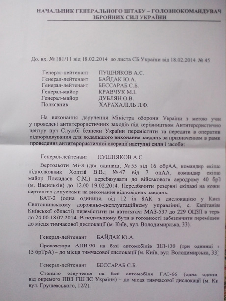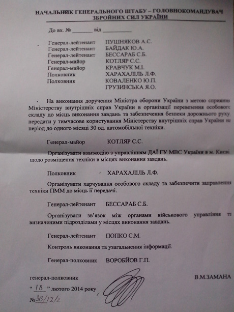 Також військові мали надати міліції три прожектори на вантажівках та одну станцію озвучення. Наказ також датовано 18 лютого.