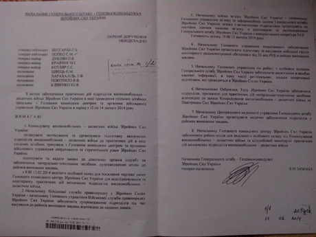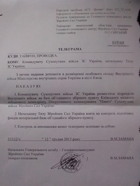 Так, у телеграмі, відправленій Командувачу сухопутних військ ЗС України та начальнику Тилу ЗС України, йдеться про "розміщення підрозділів Внутрішніх військ на базі об'єднаного збірного пункту Київського міського комісаріату Оперативного командування Північ Сухопутних військ Збройних Сил України". Наказ датовано 12 грудня 2013-го року.