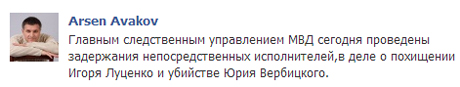 "Головним слідчим управлынням МВС сьогодні проведено затримання безпосередніх виконавців, у справі про викрадення Ігоря Луценка й убивство Юрія Вербицького", - написав він.