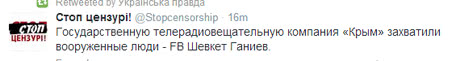 Крім того, головний редактор телекомпанії Крим Шевкет Ганієв повідомив: "Державну телерадіомовну компанія "Крим" захопили озброєні люди", повідомляє "Стоп цензурі!".