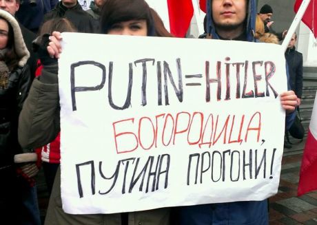 Двоє українців, які також брали участь в акції, розгорнули під ВР плакат з написом "PUTIN = Hitler. Богородица, Путина прогони".