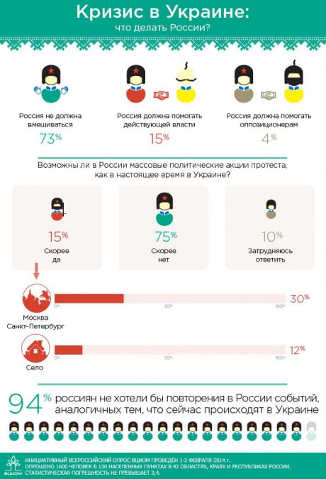 73% опитаних росіян вважали, що Росія не повинна втручатися у конфлікт між владою та опозицією в Україні, оскільки це – внутрішня справа народу іншої країни.