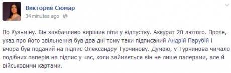 "По Кузьміну. Він завбачливо вирішив піти у відпустку. Аккурат 20 лютого. Проте, указ про його звільнення був два дні тому таки підписаний Андрієм Парубієм і вчора був поданий на підпис Олександру Турчинову", - написала вона у Facebook 5 березня.
