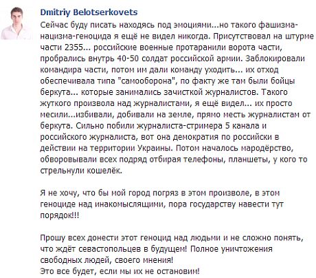 У свою чергу, в Міністерстві оборони України розповіли, що зараз близько 20 осіб штурмують командний пункт тактичної групи "Крим" Повітряних Сил України. Серед групи нападників - "козаки", а також місцеві радикали з битами, які кидають світлошумові гранати.