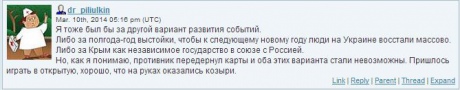 "Я теж був би за інший варіант розвитку подій. Або за півроку-рік вистойки, щоб до наступного нового року люди на Україні повстали масово. Або за Крим як незалежну державу в союзі з Росією".
