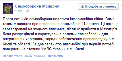 "Проти сотників самооборони ведеться інформаційна війна. Саме таким є випадок про присвоєння автомобілів 11 сотнею", - зазначено в повідомленні.