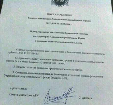 Так, згідно з постановою, Аксьонов наказує "обмежити видачу готівкових коштів у відділеннях комерційних банків (в тому числі банкомати) сумою 300 гривень".