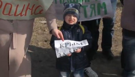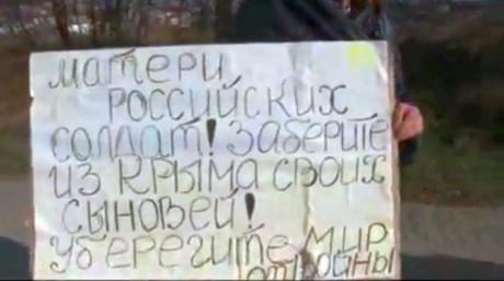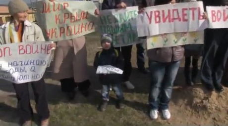 Вони тримають у руках плакати "Ні війні", "Ми – за мир", "Ні референдуму", заклики до солдатських матерів із Росії забрати своїх дітей з Криму.