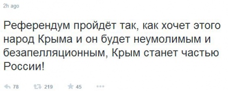 "Референдум пройде так, як хоче цього народ Криму, і він буде невблаганним і безапеляційним, Крим стане частиною Росії!", - написав Аксьонов близько 7-ї ранку.