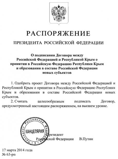 У документі міститься розпорядження "вважати за доцільне підписати Договір на найвищому рівні". Проектом договору передбачено прийняття Криму як нового суб'єкта РФ.