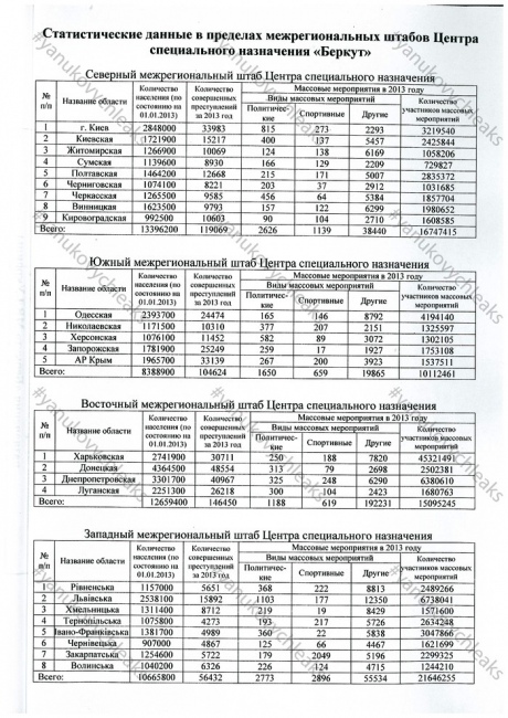 У документі під назвою "Статистичні дані в межах межрегіональних штабів Центра спеціального призначення "Беркут" наведено дані про кількість вчинених злочинів за 2013 рік.