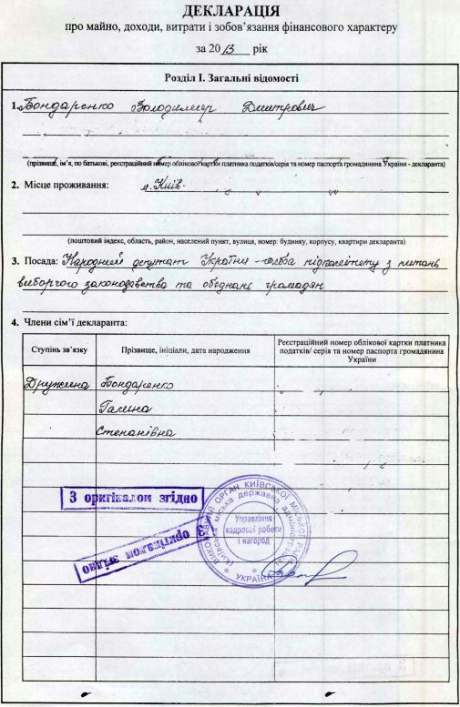 Згідно з декларацією Бондаренка за 2013 рік, він живе на депутатську зарплату. У минулому році він заробив майже 327 тис. грн, з них заробітна плата склала 206 тис. (17 тис. грн на місяць). Ще 86 тис. грн Бондаренко отримав пенсії (7200 грн в місяць).