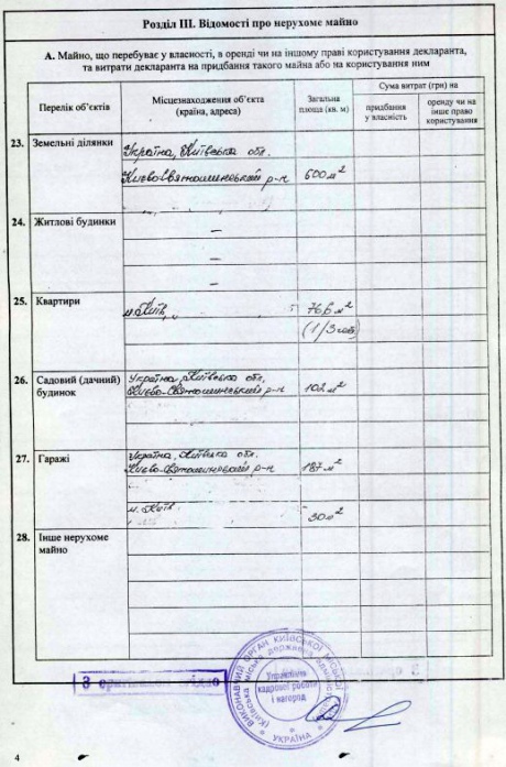 Новий керівник Києва, згідно з документом, володіє 600 кв. м землі в Києво-Святошинському районі, там же у нього будинок на 102 кв. м і гараж – 187 кв. м.