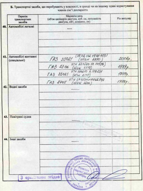 Також на членів родини, тобто дружину, записані 4 вантажні автомобілі ГАЗ.