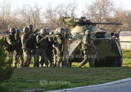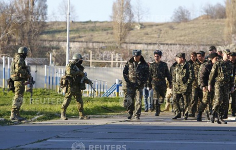 | «Самооборона» очікує завершення роботи спецназу РФ на базі у Бельбеку. Усі фото Василя Федосенка, Reuters |
