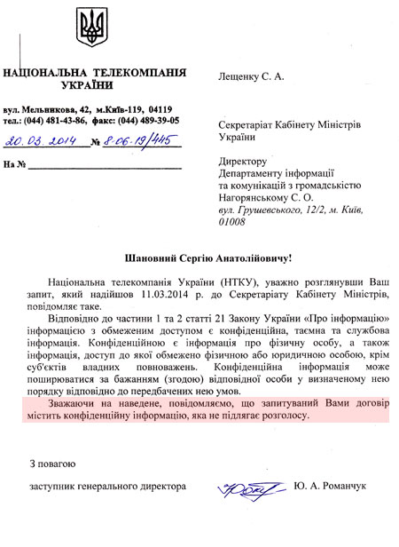 "Повідомляємо, що запитуваний вами договір містить конфіденційну інформацію, яка не підлягає розголосу", - ідеться в листі за підписом заступника гендиректора НТКУ Юрія Романчука.
