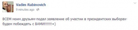 "Я балотуюся в президенти, виходячи з декількох цілей. Але одна з них – якщо не головна – спростувати міф про "антисемітизм" в Україні, показати, що в нашому суспільстві є рівні можливості для кожного", - заявив Рабинович на виході з ЦВК журналістам.