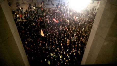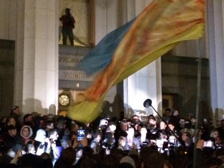 Станом на 21:20 люди, що зібралися під будівлею парламенту співали гімн, виголошували промови у мікрофон та вирішували, що робити далі - йти на штурм чи ні.