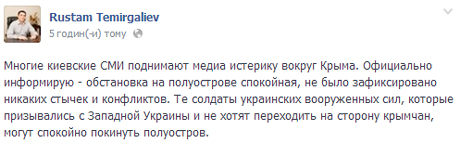 Віце-прем'єр у невизнаному уряді АРК Рустам Теміргалієв написав, що "ті солдати українських збройних сил, які призивалися з Західної України і не хочуть переходити на сторону кримчан, можуть спокійно залишити півострів".