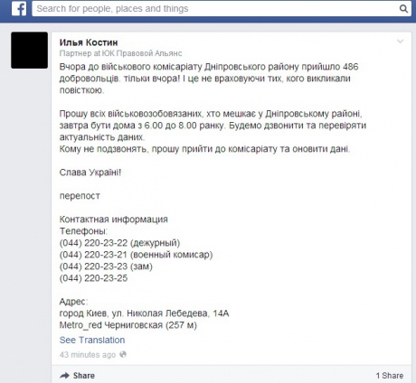 Зокрема, як пише в Facebook один із добровольців, лише вчора до військового комісаріату Дніпровського району прийшло 486 добровольців.
