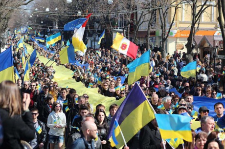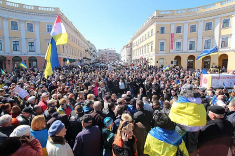 В Одесі проходить мітинг проти війни і агресивної політики Росії, передає Думская.нет. Учасників мітингу - приблизно 3 тисячі осіб. Вони підійшли до мерії. Далі планують рухатися по Дерибасівській, Преображенській, звідти до Алеї Слави і назад. Люди йдуть в колоні з величезним українським прапором.