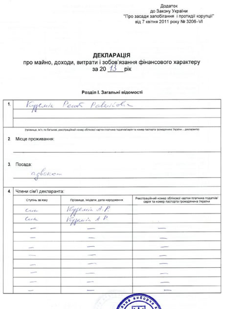 В своєї декларації в графі посада Кузьмін зазначив "адвокат".