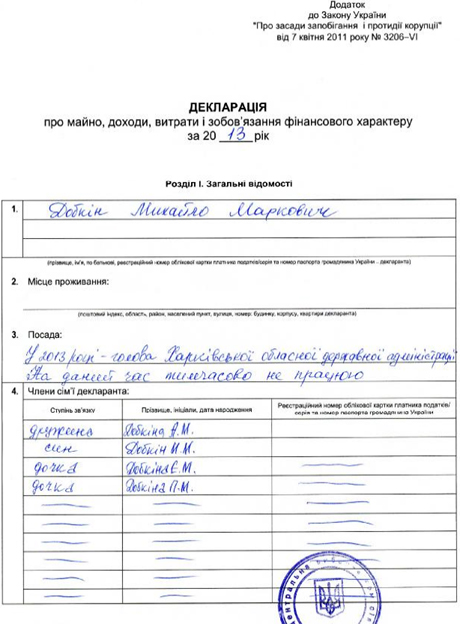 Про це йдеться у декларації Добкіна, яку наводить сайт ЦВК.
