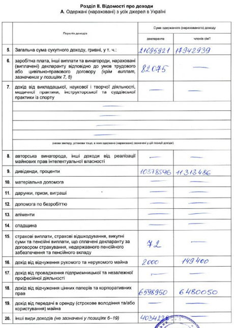 Доходи Добкіна становлять 21 095 921 гривень. З них зарплатня – 82 075 гривень, дивіденди, проценти, роялті – 10 378 596 гривень. Страхові виплати становили 72 гривні, дохід від рухомого і нерухомого майна становив 2 тисячі гривень.