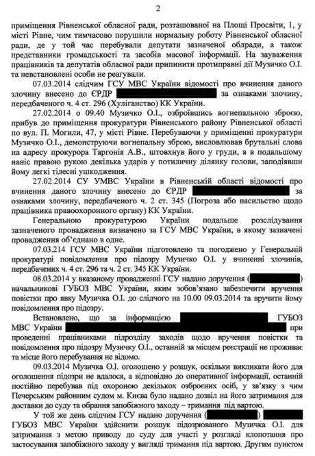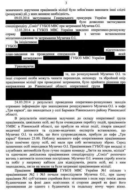 У документі зазначається, що 9 березня Музичка було оголошено в розшук, і заступник генпрокурора дозволив застосувати спецпідрозділ МВС "Сокіл" при затриманні Сашка Білого.
