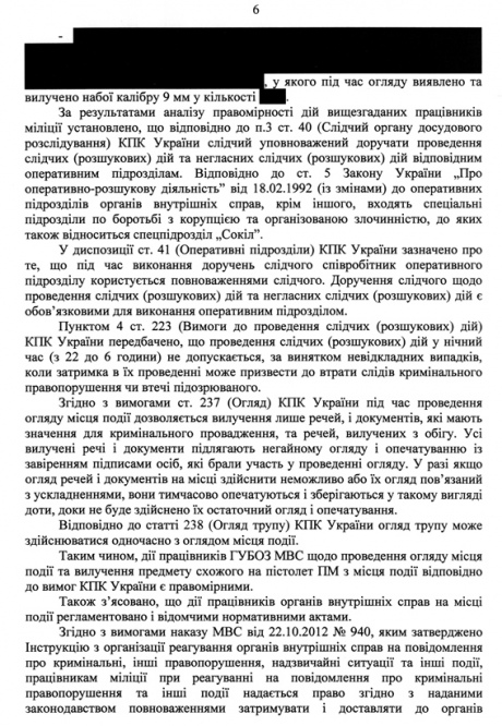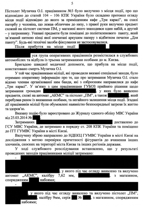"Оперативні працівники, не усвідомлюючи на той час факту смерті Музичка, відібрали з його правої руки пістолет ПМ калібру 9 мм…, завершили одягання наручників, перевернули його тіло обличчям догори та виявили ознаки вогнепальних поранень, невідкладно із застосуванням ножа з метою полегшення надання екстреної меддопомоги розрізали одяг Музичка", - йдеться у документі.