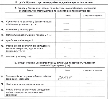 Сам в.о. генпрокурора не має заощаджень, однак члени сім’ї мають на банківському рахунку 79 тисяч 938 гривень.